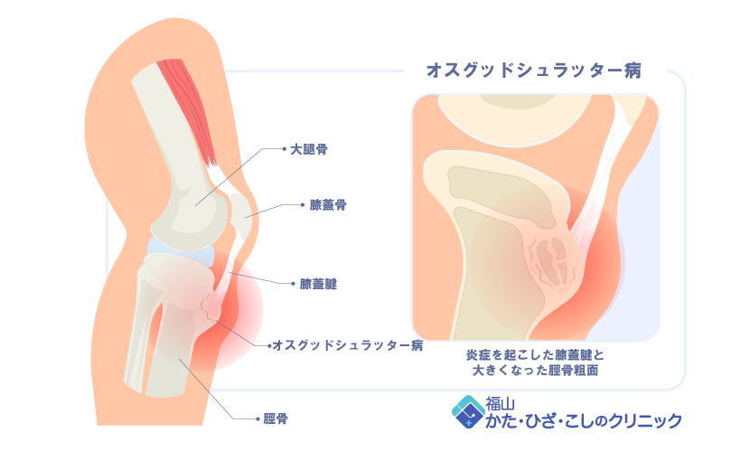 スポーツでジャンプ動作や(ボールなどを)蹴る動作をする時に膝を強く伸ばさなければいけません。膝を伸ばす動きは主に大腿四頭筋で行われていますが、大腿四頭筋が脛骨(すねの骨)に付く「脛骨粗面」という場所にくり返しの強いストレスがかかります。脛骨粗面は大人になってしまえば「膝の下にある骨のでっぱり」ですが、オスグッド病になる年代では十分に固い骨になっておらず、軟骨成分をがメインになっています。