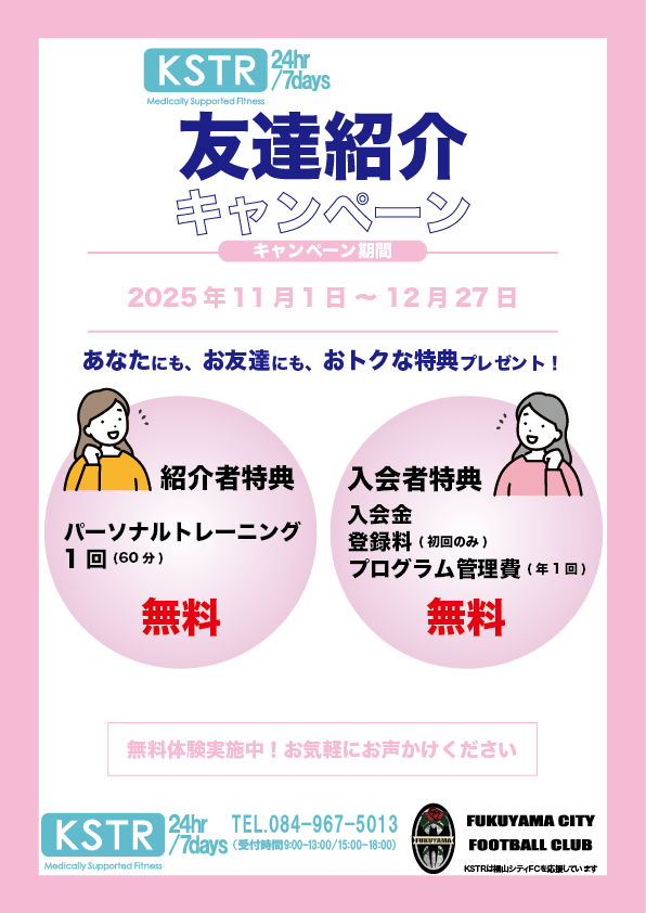 紹介していただいたかたにはパーソナルトレーニング1回60分が無料になる特典がつきます。
